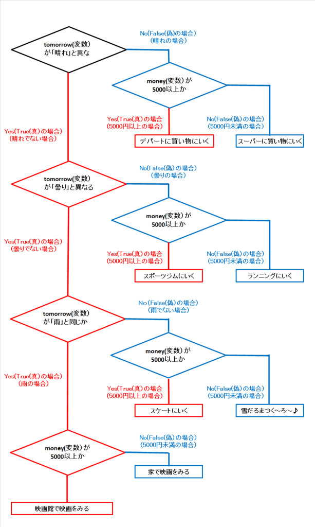 さて、前の記事(if文の入れ子(Vol.2))では「明日の天候によって、行動を変える。また、所持金によっても行動が変化する」という次のようなプログラムを作りました。