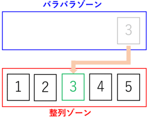 言葉だけだと分かりにくいので、図を用いて解説していきます。まず、始めに下図のように5枚の数字のカードがバラバラに並んでいるとします。