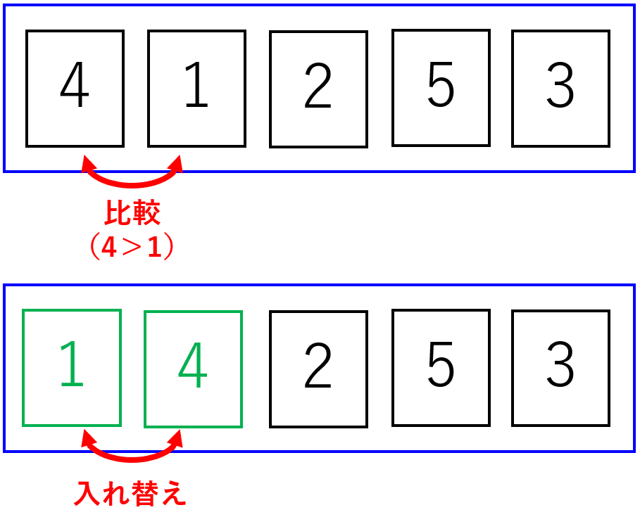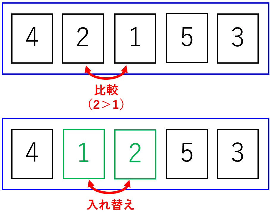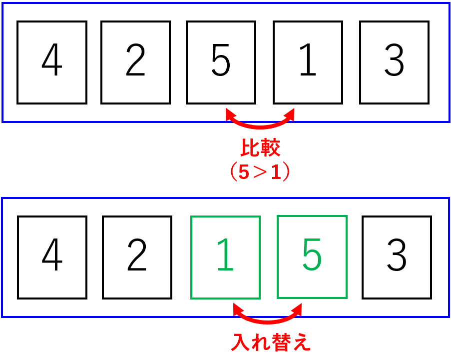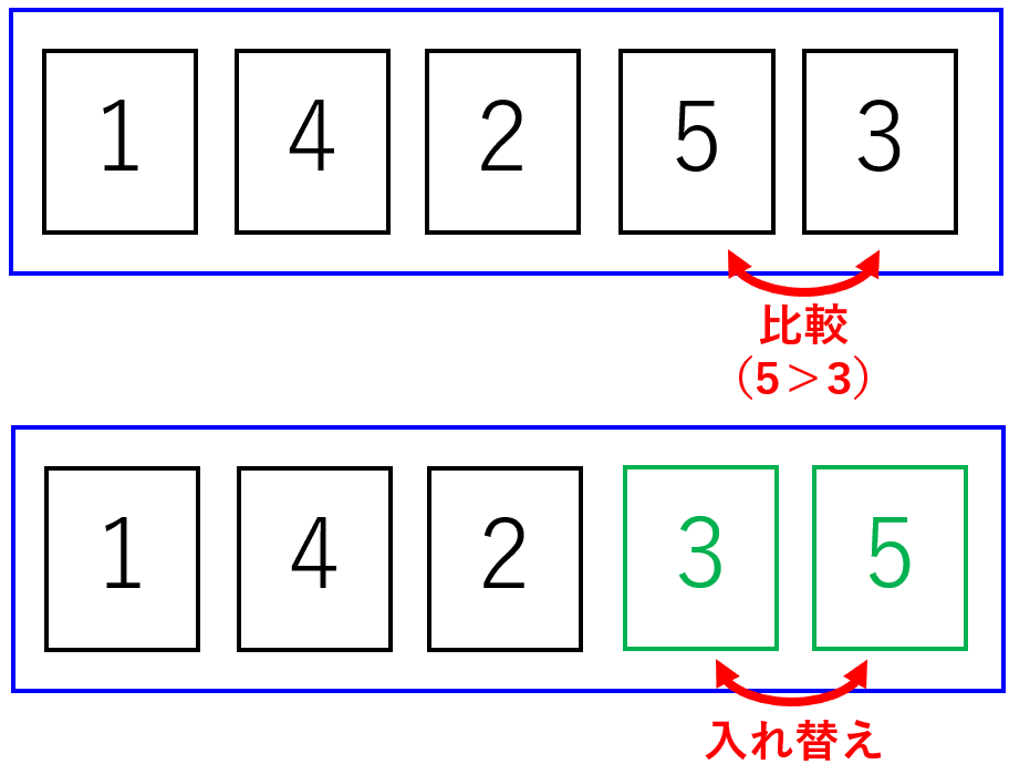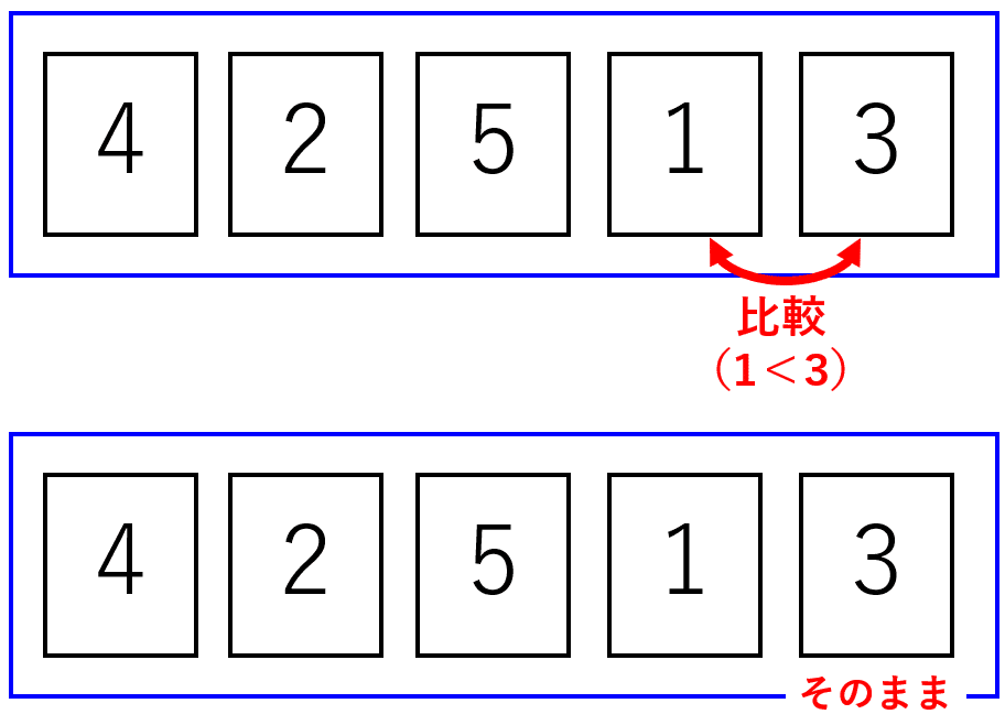 まず始めに、一番後ろのカードから順に隣り合うカードの大小を比較して、右側のカードの方が小さい場合はカードを入れ替えるという操作を行います。