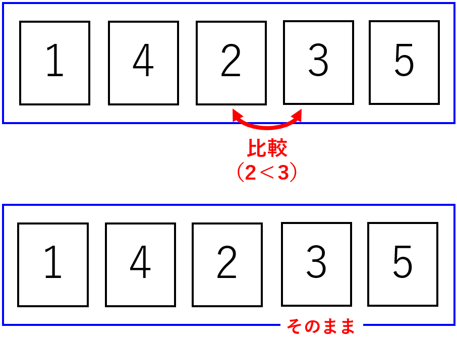 続いて、Step2-2として、23のカードを比較します。右側のカード2と左側のカード3を比較して、右側のカードの方が大きければ、そのまま。小さければカードを入れ替えます。今回は右側のカードである3のカードの方が2より大きいので、そのままにします。