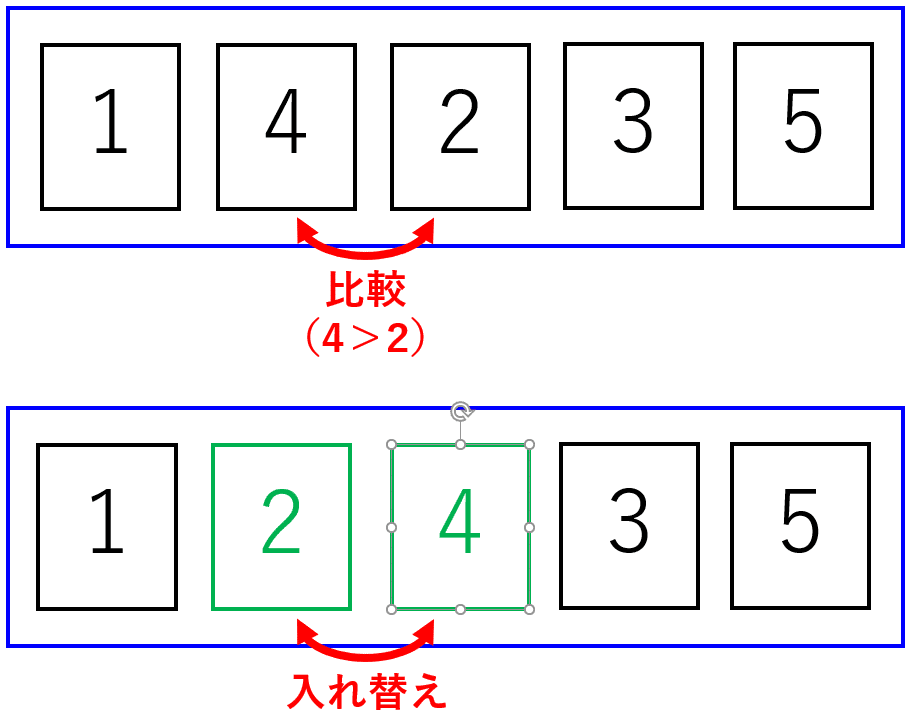 バブルソートの名前の由来ですが、各値が泡のようにふわふわ移動していく(本記事で言えば、1のカードがイメージしやすい?)のがバブルソートと言われるようになった由来とか由来でないとか…。