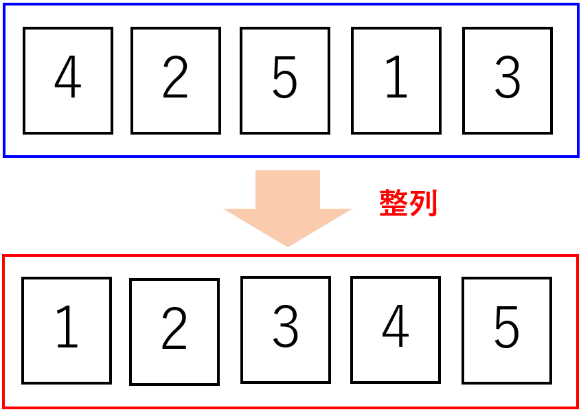 この際にバブルソートはバラバラのもの(上図青枠内)の一番後ろ(または一番前)から隣り合う数字同士の大小を比較して、昇順(または降順)になるように入れ替えてという操作を繰り返して、並べ替えるという方法でした。